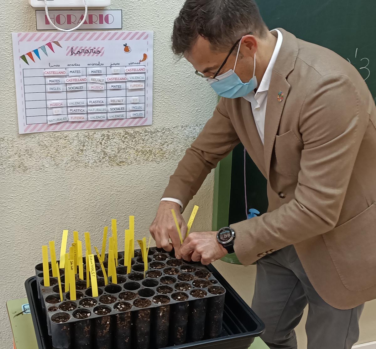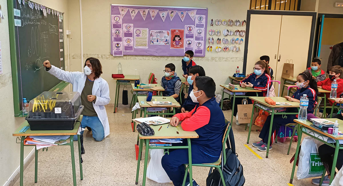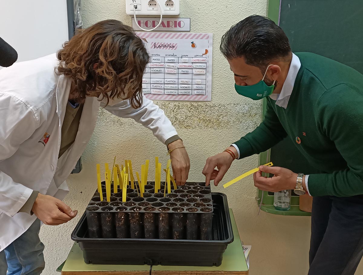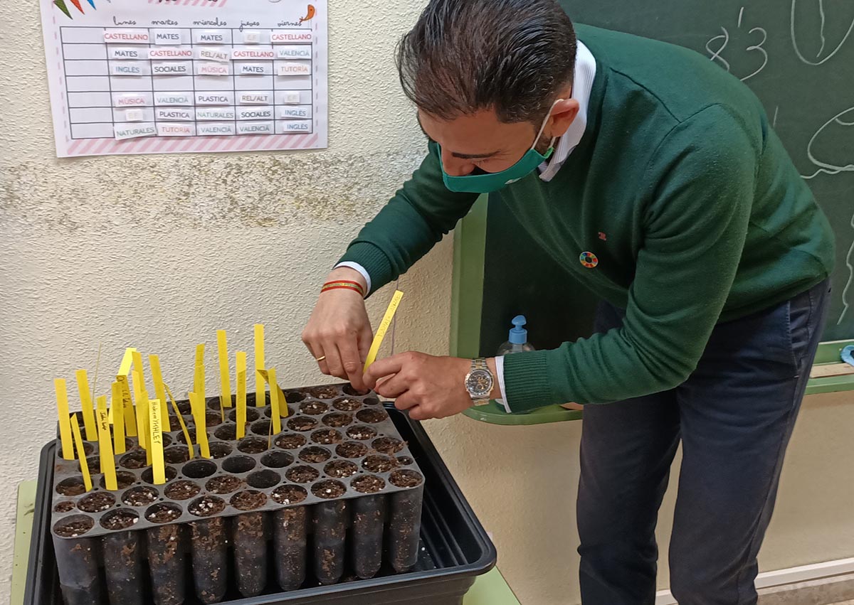Durante el mes de marzo, un monitor del Museo Didáctico e Interactivo de Ciencias de la Vega Baja (MUDIC) está yendo a los diferentes centros educativos a darles una charla a los alumnos para explicarle todo el proceso de plantación, así como ayudándoles para que realicen el proceso de germinación. Hoy le tocaba el turno al colegio Fernando de Loaces que ha recibido la visita del edil de Medio Ambiente, Dámaso Aparicio, y del gerente de Hidraqua en Orihuela, Juan José Alonso, que han estado acompañados por la directora del centro, María José Botella. Aparicio ha indicado que con esta actividad se consiguen dos objetivos: por un lado, cumplir con el objetivo del Plan Director del Palmeral de plantar hasta 3.000 palmeras en 10 años y, por otro, crear un vínculo emocional entre los jóvenes con el Palmeral y que, de esta forma, lo vean con otra visión que permita su mayor cuidado en los próximos años por estas generaciones que son las que gobernarán este municipio en un futuro.