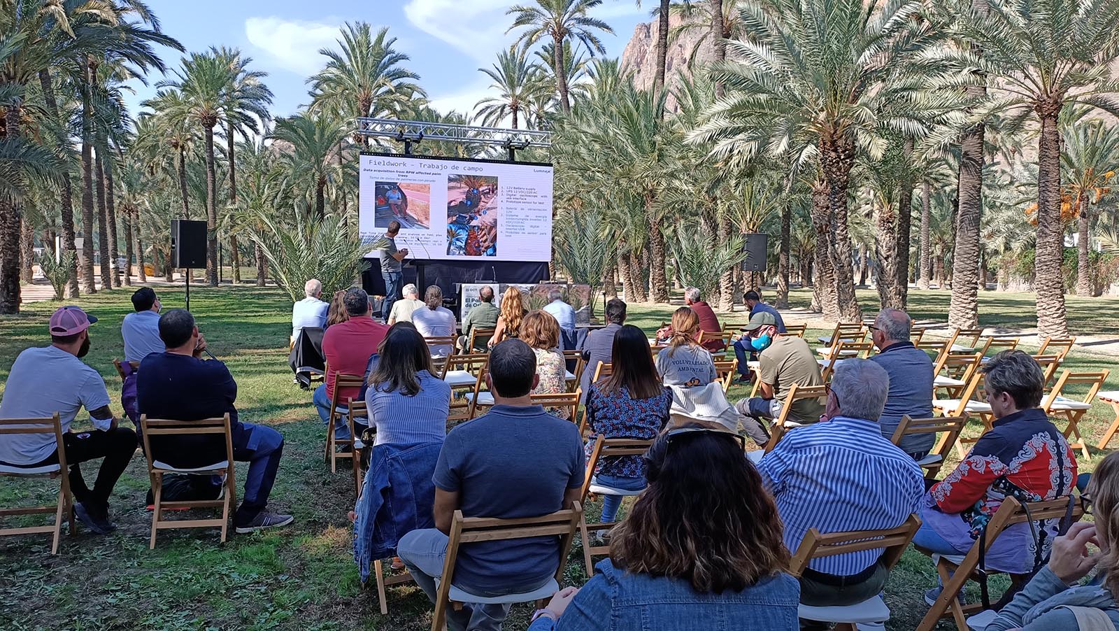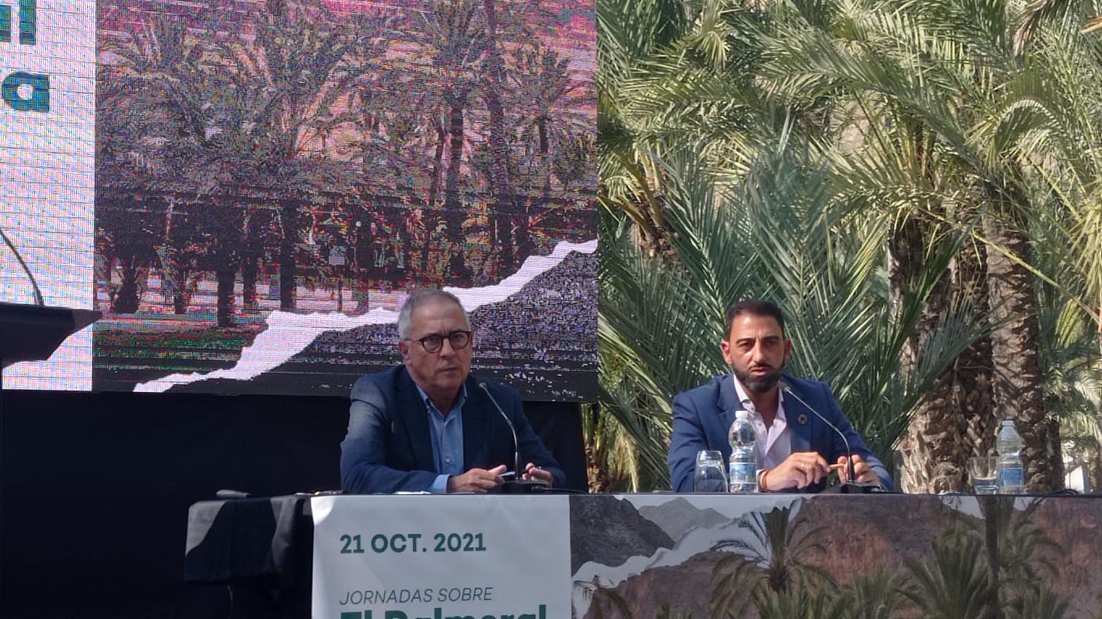 A continuación, se inició la parte técnica del programa con la recuperación. Eduardo Rodríguez Carmona, jefe del Servicio de Medio Ambiente del Ayuntamiento de Orihuela, dio a conocer que, al margen de los citados fondos FEDER, con los de la estrategia EDUSI ha sido posible realizar el Plan Director del Palmeral y el contrato para el mantenimiento y conservación de este paraje, adjudicado por dos años a la empresa Actúa Servicios y Medio Ambiente por 674.313, 59 euros, con opción de dos más de prórroga, por lo que la inversión global en este paraje superaría los dos millones de euros. Inmediatamente después, Luis Pablo Martínez, técnico de Patrimonio Mueble de la Conselleria de Cultura, abogó por avanzar en otro tipo de recuperación: la de los terrenos agrícolas que caracterizan el BIC.