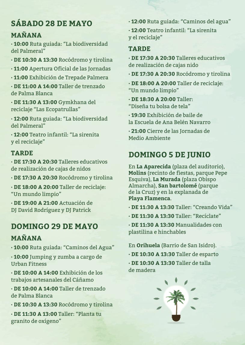 Los días 28 y 29 de mayo viviremos otro mágico fin de semana con talleres infantiles, teatro, exhibiciones de trepa de palmera, rocódromo, tirolina, demostraciones de los trabajos artesanales del cáñamo, actuaciones de los DJs David Rodríguez y Patrick, de la Escuela de Danza de Ana Belén Navarro, Jumping y Zumba, a cargo de Urban Fitness, visitas guiadas y mucho más. Para las visitas guiadas habrá que apuntarse como es habitual a través de la página www.palmeraldeorihuela.com
